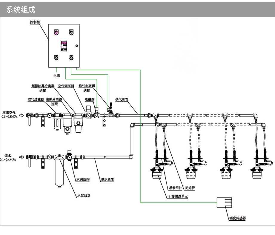 利用空壓機氣體將水霧化,水霧顆粒細、揮發快、效率高。